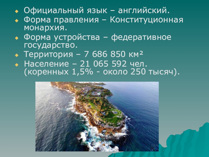 Официальный язык – английский.Форма правления – Конституционная монархия. Форма устройства – федеративное государство.Территория – 7 686 850 км²Население –