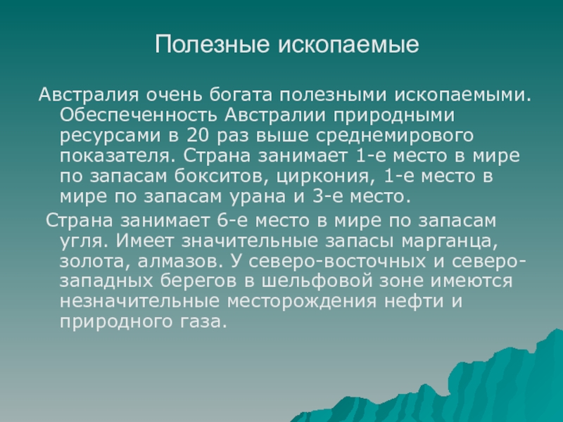 Полезные ископаемыеАвстралия очень богата полезными ископаемыми. Обеспеченность Австралии природными ресурсами в 20 раз выше среднемирового показателя. Страна