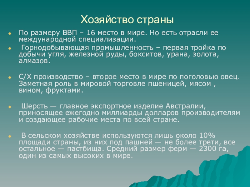 Хозяйство страныПо размеру ВВП – 16 место в мире. Но есть отрасли ее международной специализации. Горнодобывающая промышленность