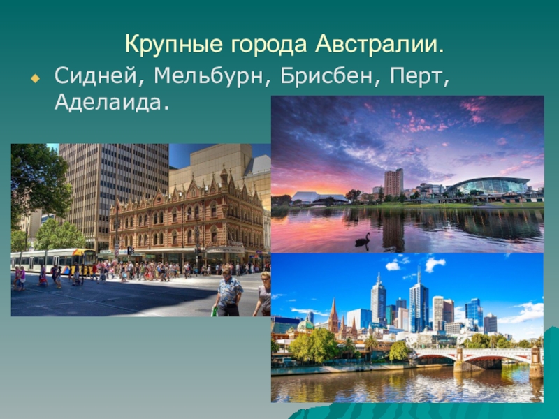 Крупные города Австралии.Сидней, Мельбурн, Брисбен, Перт, Аделаида.