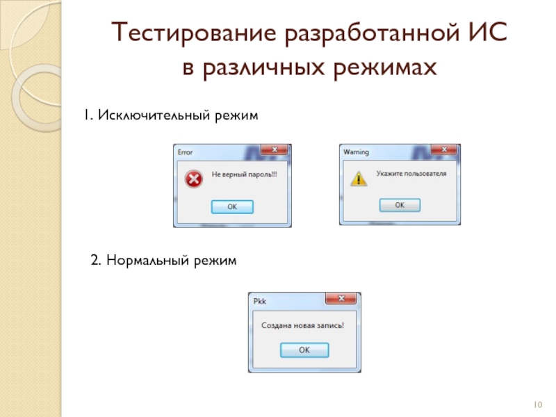 Слайд 10Тестирование разработанной ИС в различных режимах