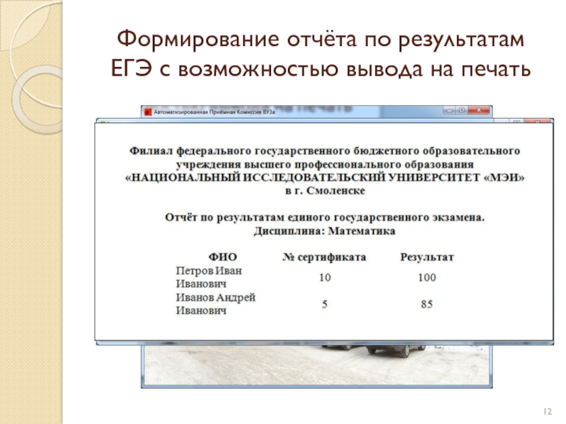 Слайд 12Формирование отчёта по результатам ЕГЭ с возможностью вывода на печать
