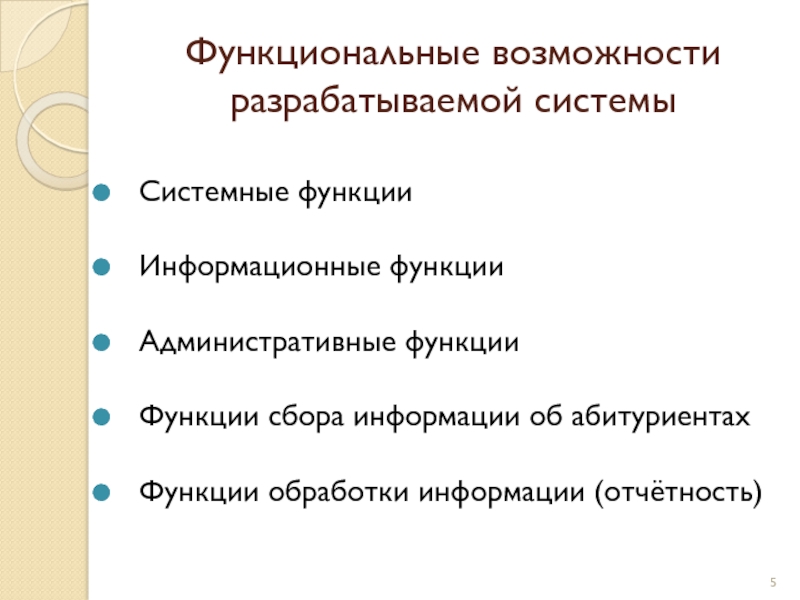Функциональные возможности разрабатываемой системыСистемные функцииИнформационные функцииАдминистративные функцииФункции сбора информации об абитуриентахФункции обработки информации (отчётность)