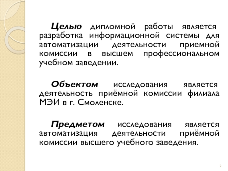 Слайд 1Автоматизация деятельности приемной комиссии филиала МЭИ в г. Смоленске