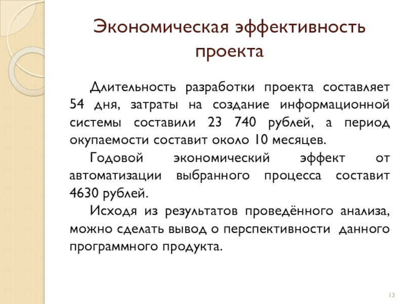Экономическая эффективность проектаДлительность разработки проекта составляет 54 дня, затраты на создание информационной системы составили 23 740 рублей,