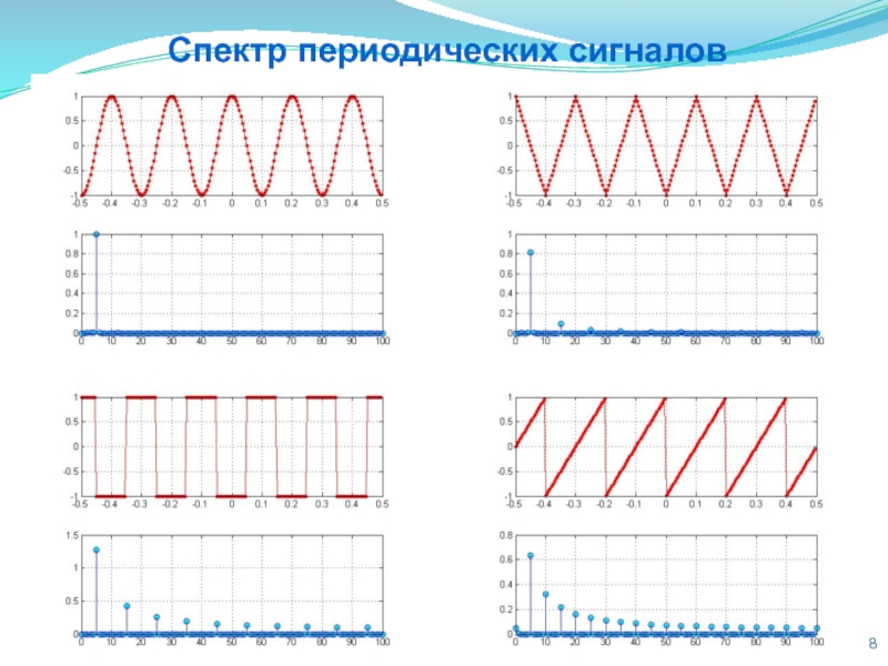 Примеры разложения сигналов в ряд Фурье1. Сигнал в форме меандра:2. Сигнал треугольной формы:3. Пилообразный сигнал: