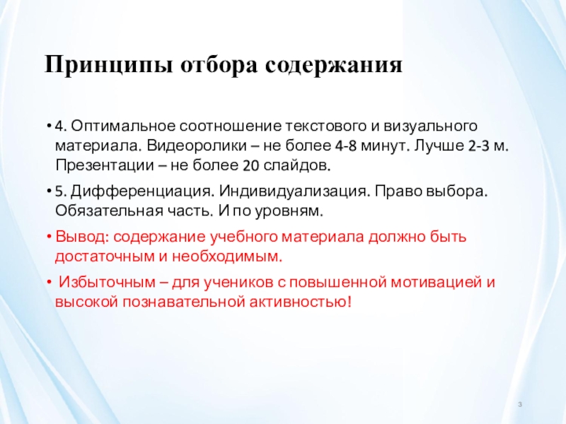 Вывод: содержание учебного материала должно быть достаточным и необходимым.