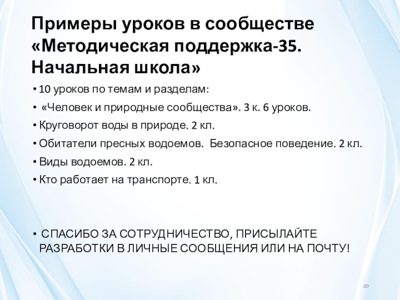 Слайд 20Примеры уроков в сообществе «Методическая поддержка-35. Начальная школа»