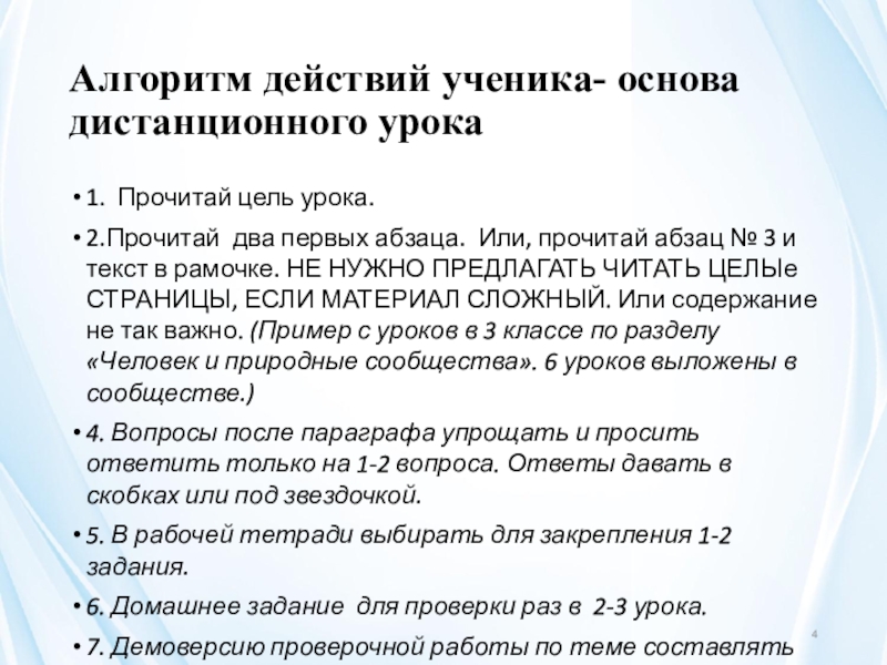Слайд 4Алгоритм действий ученика- основа дистанционного урока
