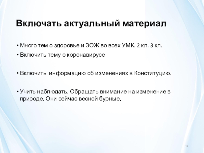 Слайд 16Включать актуальный материал