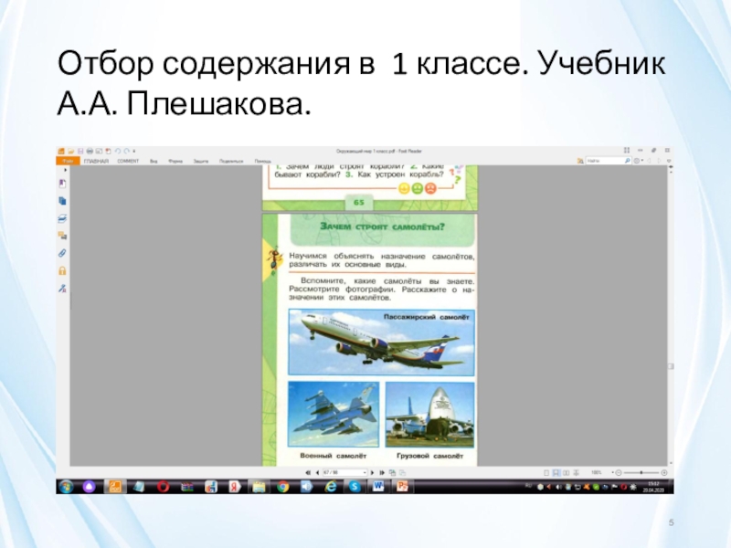Слайд 5Отбор содержания в 1 классе. Учебник А.А. Плешакова.