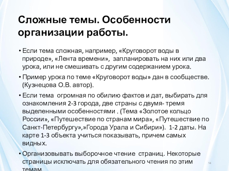 Слайд 14Сложные темы. Особенности организации работы.