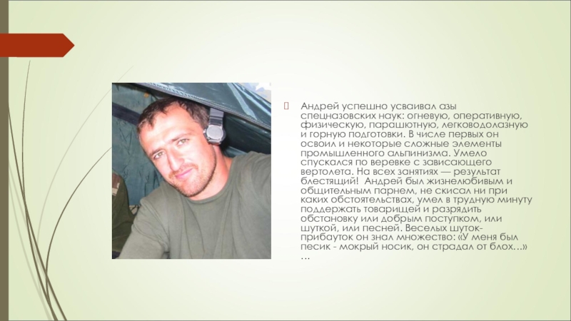 Слайд 6Андрей успешно усваивал азы спецназовских наук: огневую, оперативную, физическую, парашютную,