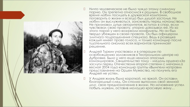 Андрей Туркин участвовал и в операции по освобождению заложников в Театральном центре на Дубровке. Было у него еще немало опасных командировок. Свидетельство тому – медаль ордена «За заслуги перед Отечеством» второй степени с мечами,а весной 2004 года командир группы «Вымпел» направил представление на Орден Мужества, но получить его Андрей не успел.