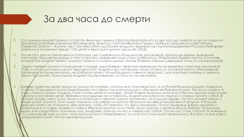 сидел на бронетранспортере в зеленом бронежилете. Вместе с группой «Вымпел» Туркин прибыл в город Беслан республики Северная Осетия — Алания, где 1 сентября 2004 года более тридцати террористов под командованием Руслана Хучбарова захватили в заложники свыше 1100 детей и взрослых в здании школы № 1[5][6].