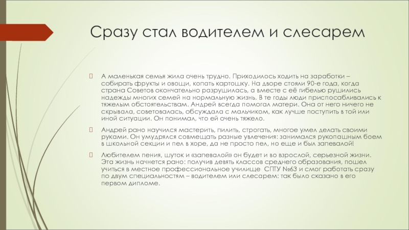 Слайд 4Сразу стал водителем и слесарем
