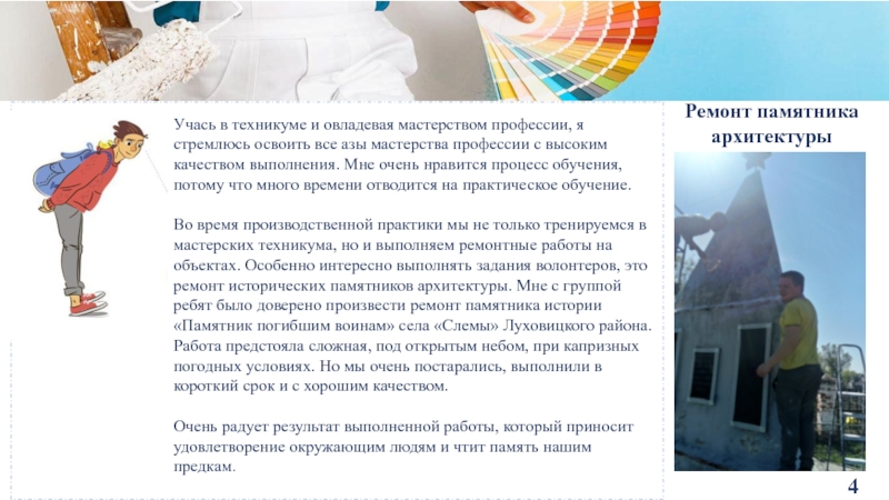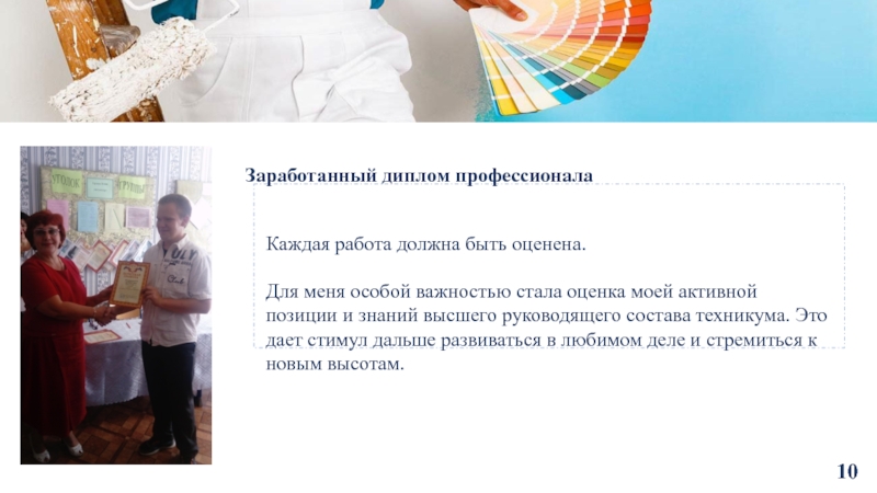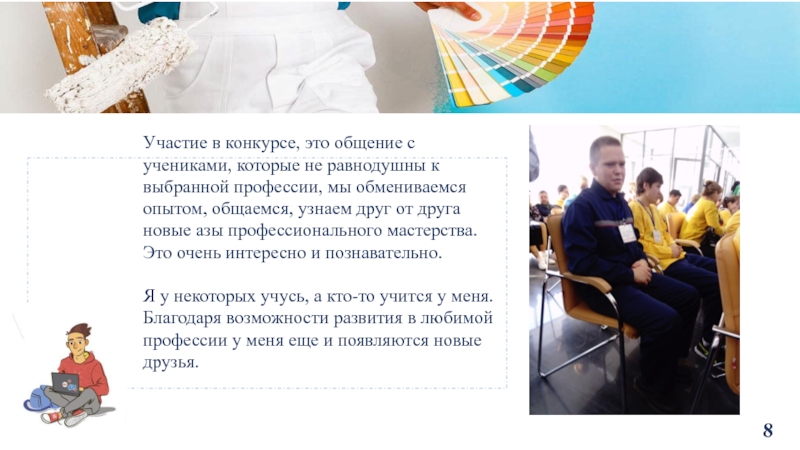 на достигнутом обучающийся, участвовал в нескольких конкурсах. Выполняя конкурсные задания, стремишься выложить все свои знания по профессии, которые получил от мастеров и наставников, и в то же время добавить что-то свое. Прививается любовь к профессии , опыт и стремление творить и побеждать. Мне очень нравится идти вперед и не останавливаться на достигнутом. К каждому конкурсу я со своим наставником тщательно готовлюсь, чтобы показать отличный результат.