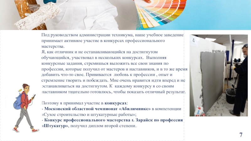 - Конкурс профессионального мастерства г. Зарайск по профессии «Штукатур», получил диплом второй степени.