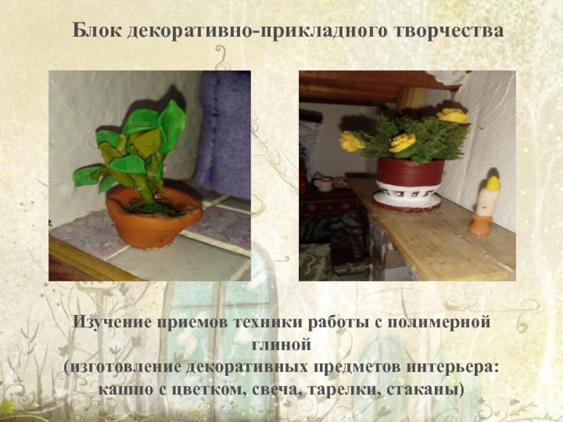 Блок декоративно-прикладного творчестваИзучение приемов техники работы с полимерной глиной (изготовление декоративных предметов интерьера: кашпо с цветком, свеча,