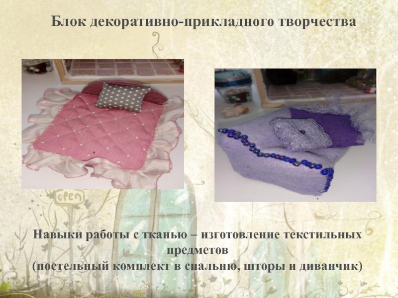 Блок декоративно-прикладного творчестваНавыки работы с тканью – изготовление текстильных предметов (постельный комплект в спальню, шторы и диванчик)