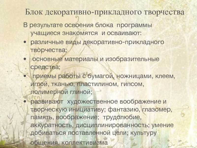 Блок декоративно-прикладного творчестваВ результате освоения блока программы учащиеся знакомятся и осваивают:различные виды декоративно-прикладного творчества; основные материалы и