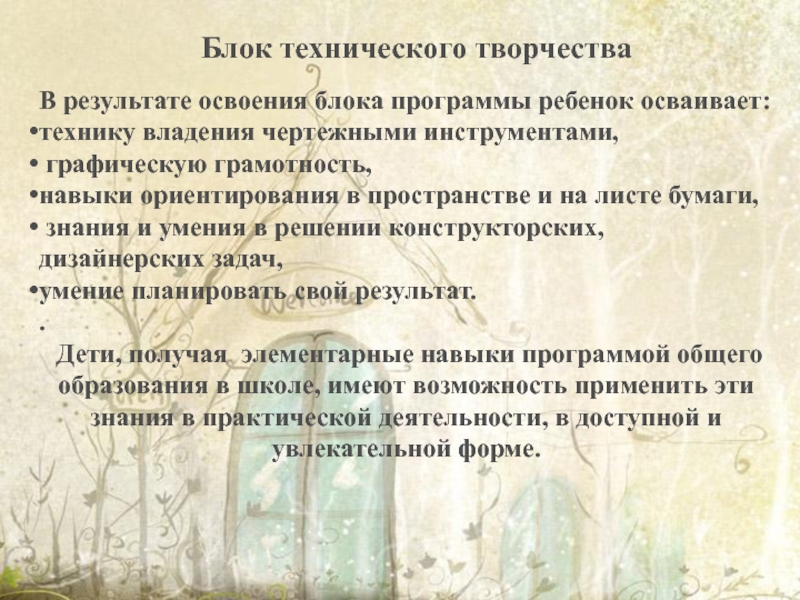 Блок технического творчестваВ результате освоения блока программы ребенок осваивает: технику владения чертежными инструментами, графическую грамотность, навыки ориентирования