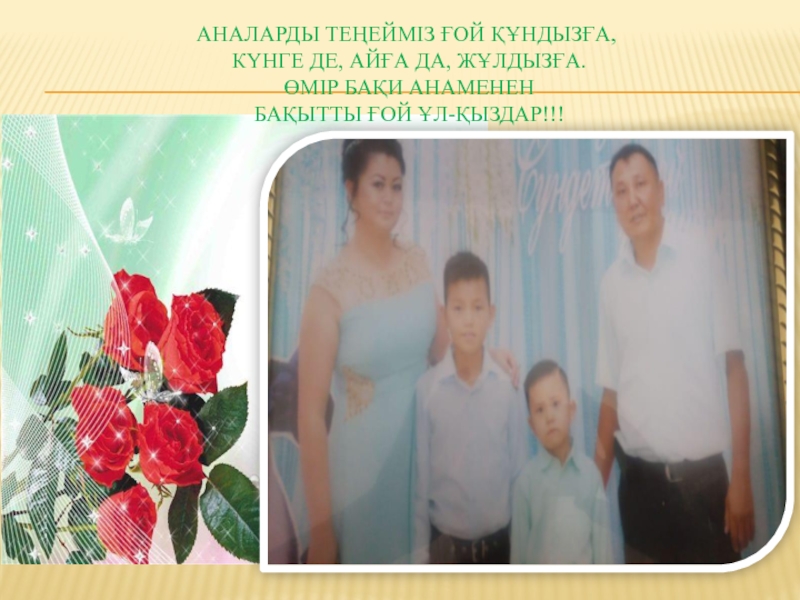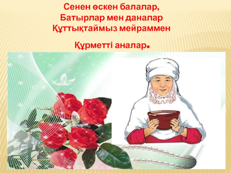 Слайд 16 Аналарды теңейміз ғой құндызға, Күнге де, айға да, жұлдызға. Өмір