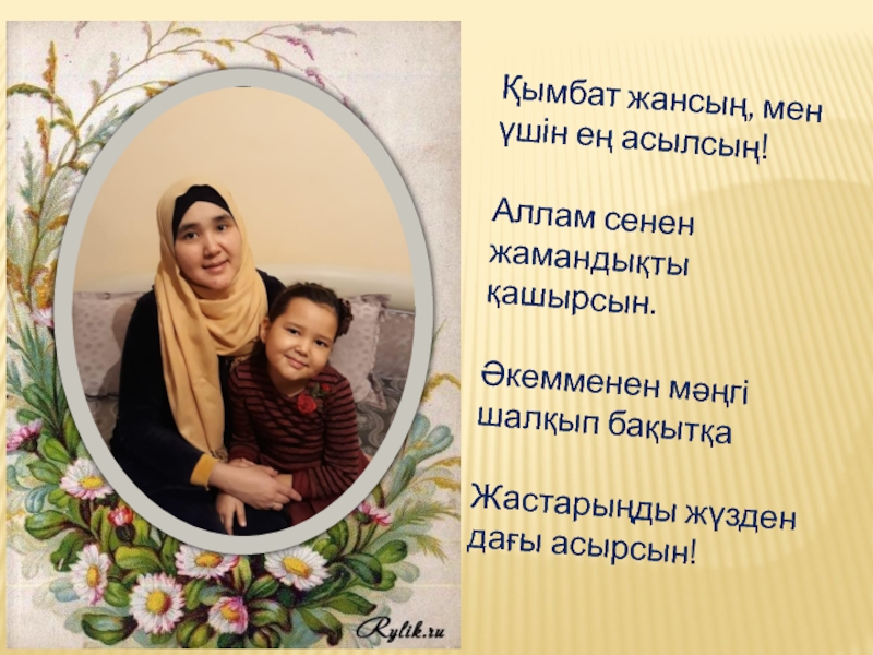 Қымбат жансың, мен үшін ең асылсың! Аллам сенен жамандықты қашырсын. Әкемменен мәңгі шалқып бақытқа Жастарыңды жүзден дағы