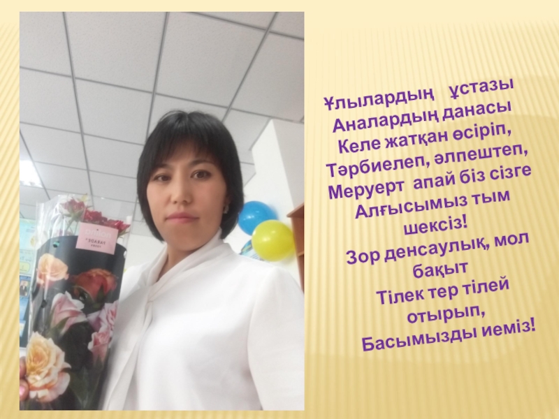 Ұлылардың  ұстазыАналардың данасыКеле жатқан өсіріп,Тәрбиелеп, әлпештеп,Меруерт апай біз сізгеАлғысымыз тым шексіз!Зор денсаулық, мол бақытТілек тер тілей