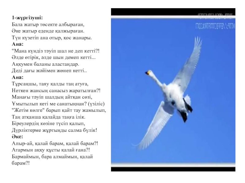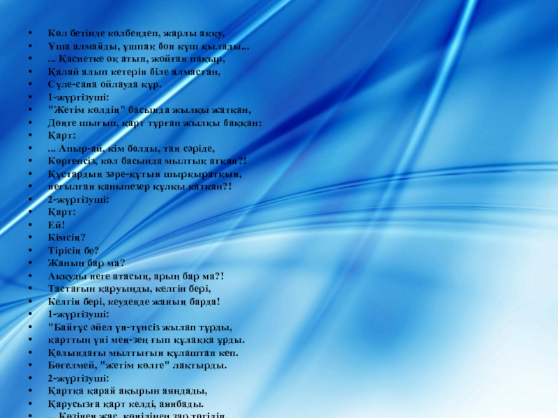 Слайд 29Көл бетінде көлбеңдеп, жарлы аққу,