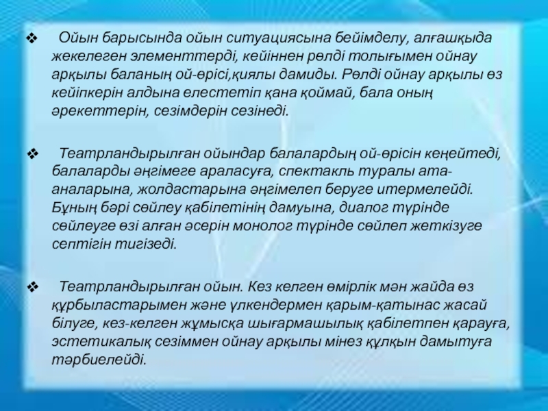 Театрландырылған ойын. Кез келген өмірлік мән жайда өз құрбыластарымен және үлкендермен қарым-қатынас жасай білуге, кез-келген жұмысқа шығармашылық қабілетпен қарауға, эстетикалық сезіммен ойнау арқылы мінез құлқын дамытуға тәрбиелейді.