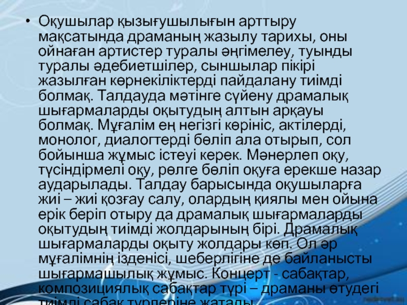 тиімді болмақ. Талдауда мәтінге сүйену драмалық шығармаларды оқытудың алтын арқауы болмақ. Мұғалім ең негізгі көрініс, актілерді, монолог, диалогтерді бөліп ала отырып, сол бойынша жұмыс істеуі керек. Мәнерлеп оқу, түсіндірмелі оқу, рөлге бөліп оқуға ерекше назар аударылады. Талдау барысында оқушыларға жиі – жиі қозғау салу, олардың қиялы мен ойына ерік беріп отыру да драмалық шығармаларды оқытудың тиімді жолдарының бірі. Драмалық шығармаларды оқыту жолдары көп. Ол әр мұғалімнің ізденісі, шеберлігіне де байланысты шығармашылық жұмыс. Концерт - сабақтар, композициялық сабақтар түрі – драманы өтудегі тиімді сабақ түрлеріне жатады.