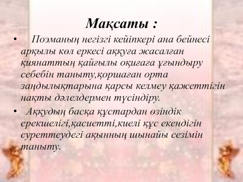 Аққудың басқа құстардан өзіндік ерекшелігі,қасиетті,киелі құс екендігін суреттеудегі ақынның шынайы сезімін таныту.