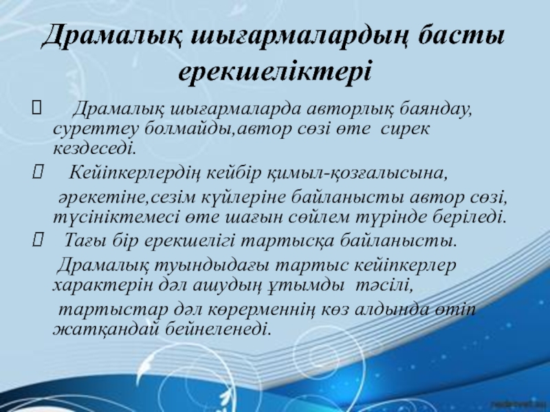 Слайд 4Драмалық шығармалардың басты ерекшеліктері