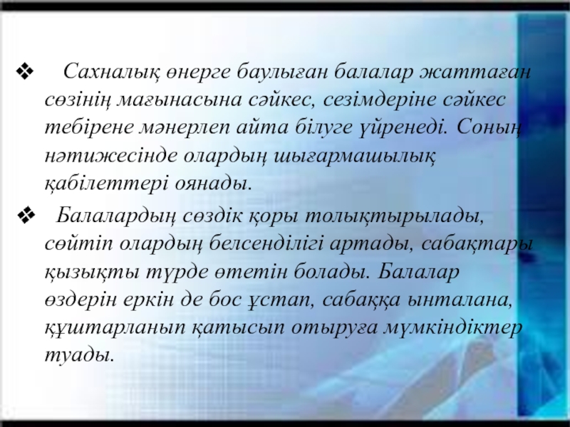 Слайд 13 Сахналық өнерге баулыған балалар жаттаған сөзінің мағынасына сәйкес,