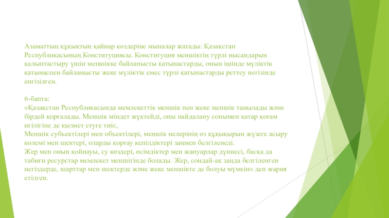 мүліктік қатынаспен байланысты жеке мүліктік емес түрлі қатынастарды реттеу негізінде енгізілген. 6-бапта: «Қазақстан Республикасында мемлекеттік меншік пен жеке меншік танылады және бірдей қорғалады. Меншік міндет жүктейді, оны пайдалану сонымен қатар қоғам игілігіне де қызмет етуге тиіс, Меншік субъектілері мен объектілері, меншік иелерінің өз құқықырын жүзеге асыру көлемі мен шектері, оларды қорғау кепілдіктері заңмен белгіленеді. Жep мен оның қойнауы, су көздері, өсімдіктер мен жануарлар дүниесі, басқа да табиғи ресурстар мемлекет меншігінде болады. Жер, сондай-ақ заңда белгіленген негіздерде, шарттар мен шектерде және жеке меншікте де болуы мүмкін» деп жария етілген.