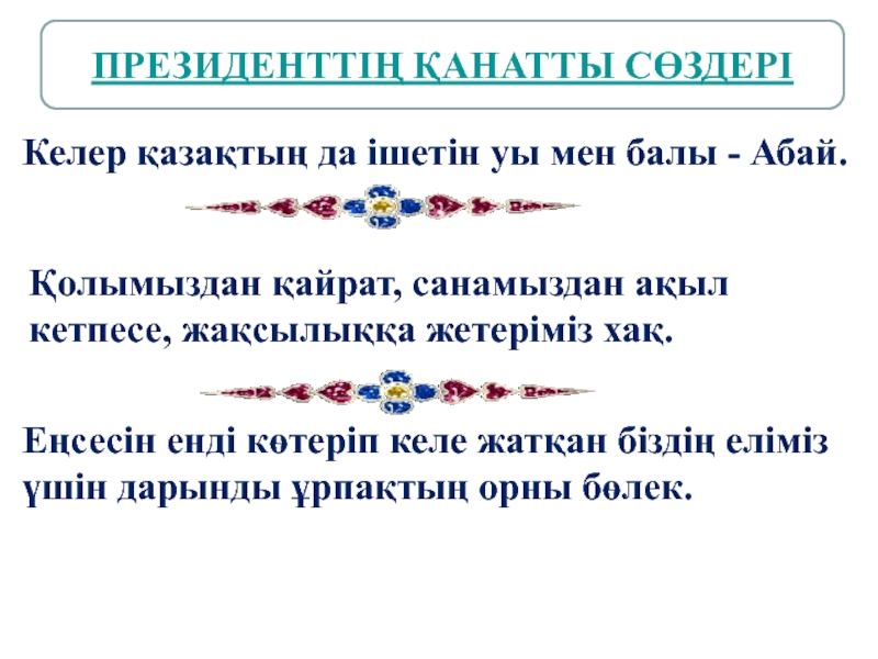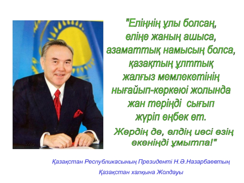 Алатауға дейін ұлан – ғайыр жерді мекен еткен ата – бабаларымыз тәуелсіздікті арман еткен. Осынау кең даланы көк найзаның ұшымен, сом білектің күшімен қорғаған бабаларымыздың аманатын орындау үшін талай боздақтар жанкештілікке барған. Қаракерей Қабанбай, Қанжығалы Бөгенбай батырлардан бастап, Иса Досан, Шотан батырлар, беріректе Бауыржан, Мәншүк, Әлия сынды батырлар сол ел қорғауды ұран еткен, сол үшін құрбан болып, ел құрметіне бөленген батырлар.Ресейдің езгісінде болып, тіліміз бен дінімізден безіп, орыстанғалы тұрғанда Қайрат Рысқұлбеков, Ләззат Асанова сияқты қыршын жастардың құрбандыққа баруы арқасында ғана тәуелсіздік алып, егеменді ел болдық.