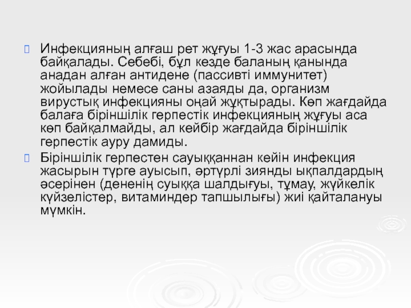 саны азаяды да, организм вирустық инфекцияны оңай жұқтырады. Көп жағдайда балаға біріншілік герпестік инфекцияның жұғуы аса көп байқалмайды, ал кейбір жағдайда біріншілік герпестік ауру дамиды.