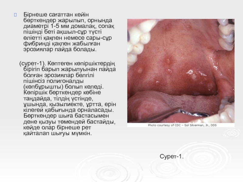 (сурет-1). Көптеген көпіршіктердің бірігіп барып жарылуынан пайда болған эрозиялар белгілі пішінсіз полигоналды (көпбұрышты) болып келеді. Көпіршік бөрткендер көбіне таңдайда, тілдің үстінде, ұшында, қызылиекте, ұртта, ерін кілегей қабығында орналасады. Бөрткендер шыға бастасымен дене қызуы төмендей бастайды, кейде олар бірнеше рет қайталап шығуы мүмкін.