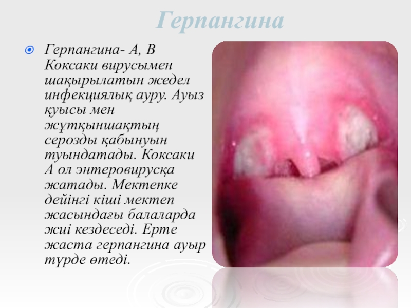 Герпангина- А, В Коксаки вирусымен шақырылатын жедел инфекциялық ауру. Ауыз