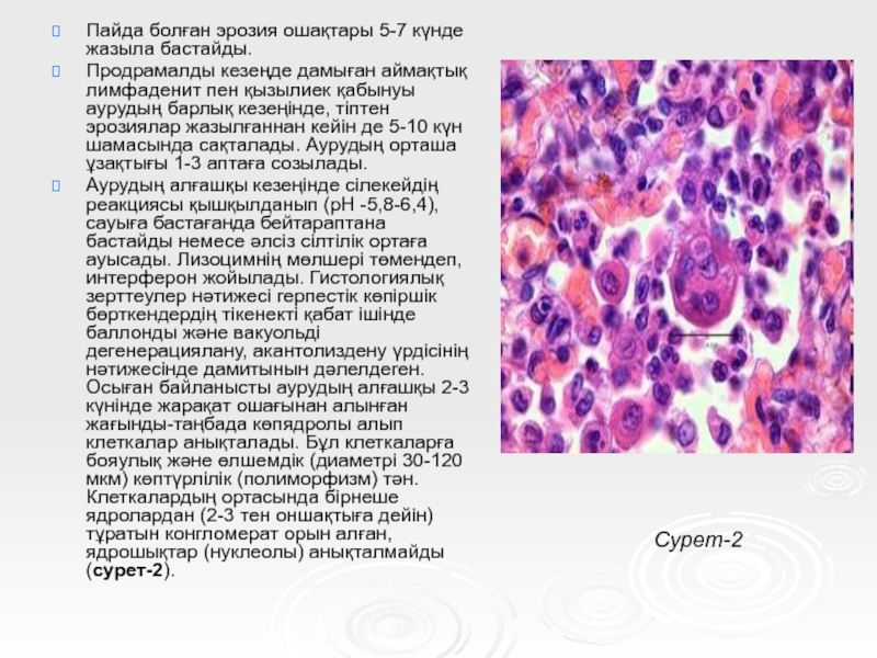 Аурудың алғашқы кезеңінде сілекейдің реакциясы қышқылданып (рН -5,8-6,4), сауыға бастағанда бейтараптана бастайды немесе әлсіз сілтілік ортаға ауысады. Лизоцимнің мөлшері төмендеп, интерферон жойылады. Гистологиялық зерттеулер нәтижесі герпестік көпіршік бөрткендердің тікенекті қабат ішінде баллонды және вакуольді дегенерациялану, акантолиздену үрдісінің нәтижесінде дамитынын дәлелдеген. Осыған байланысты аурудың алғашқы 2-3 күнінде жарақат ошағынан алынған жағынды-таңбада көпядролы алып клеткалар анықталады. Бұл клеткаларға бояулық және өлшемдік (диаметрі 30-120 мкм) көптүрлілік (полиморфизм) тән. Клеткалардың ортасында бірнеше ядролардан (2-3 тен оншақтыға дейін) тұратын конгломерат орын алған, ядрошықтар (нуклеолы) анықталмайды (сурет-2).