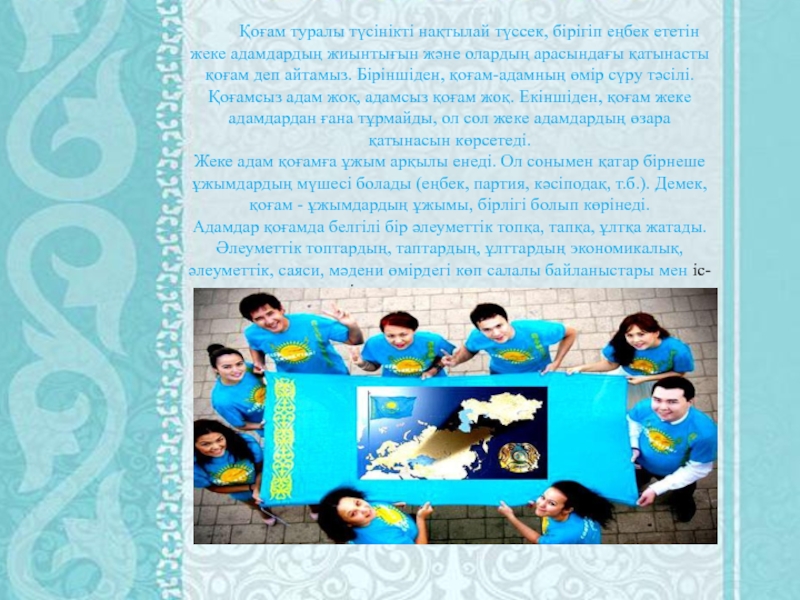 Слайд 2Қоғам туралы түсінікті нақтылай түссек, бірігіп еңбек ететін жеке адамдардың