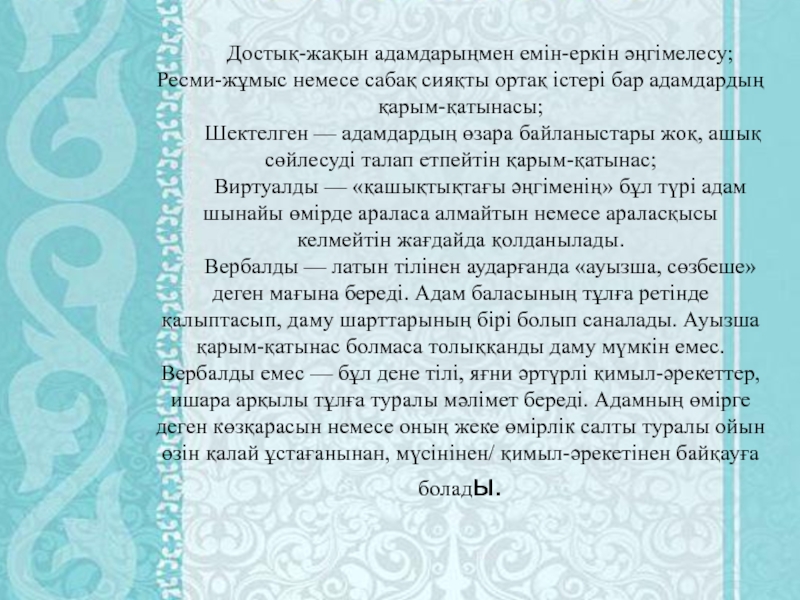 Слайд 3Достық-жақын адамдарыңмен емін-еркін әңгімелесу; Ресми-жұмыс немесе сабақ сияқты ортақ істері