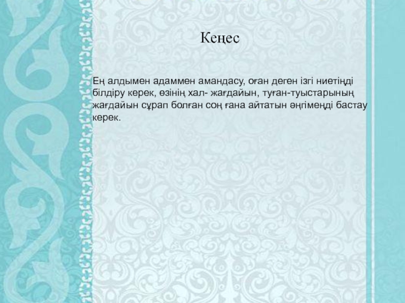 КеңесЕң алдымен адаммен амандасу, оған деген ізгі ниетіңді білдіру керек, өзінің хал- жағдайын, туған-туыстарының жағдайын сұрап болған