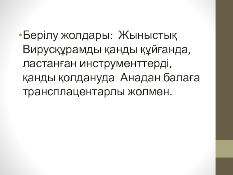 -5-10% Мед.жұмысшылардың профессиональді зақымдалушылары – 0,01% аз Ластанған қанды құю-3-5% Жүктіліктен немесе бала емізуші анадан-5-10%