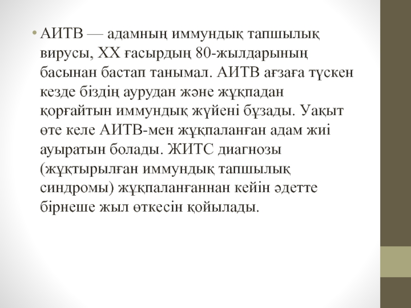 жұқпадан қорғайтын иммундық жүйені бұзады. Уақыт өте келе АИТВ-мен жұқпаланған адам жиі ауыратын болады. ЖИТС диагнозы (жұқтырылған иммундық тапшылық синдромы) жұқпаланғаннан кейін әдетте бірнеше жыл өткесін қойылады.
