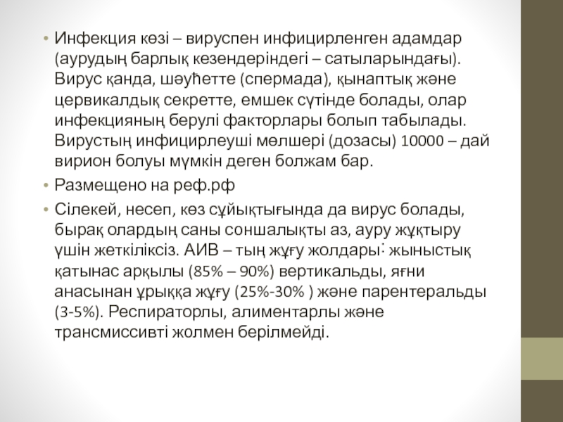 Сілекей, несеп, көз сұйықтығында да вирус болады, бырақ олардың саны соншалықты аз, ауру жұқтыру үшін жеткіліксіз. АИВ – тың жұғу жолдары˸ жыныстық қатынас арқылы (85% – 90%) вертикальды, яғни анасынан ұрыққа жұғу (25%-30% ) және парентеральды (3-5%). Респираторлы, алиментарлы және трансмиссивті жолмен берілмейді.
