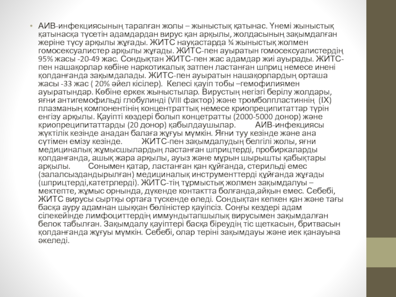 арқылы жұғады. ЖИТС науқастарда ¾ жыныстық жолмен гомосексуалистер арқылы жұғады. ЖИТС-пен ауыратын гомосексуалистердің 95% жасы -20-49 жас. Сондықтан ЖИТС-пен жас адамдар жиі ауырады. ЖИТС-пен нашақорлар көбіне наркотикалық затпен ластанған шприц немесе инені қолданғанда зақымдалады. ЖИТС-пен ауыратын нашақорлардың орташа жасы -33 жас ( 20% әйел кісілер). Келесі қауіп тобы –гемофилиямен ауыратындар. Көбіне еркек жыныстылар. Вирустың негізгі берілу жолдары, яғни антигемофильді глобулинді (VIII фактор) және тромболпластиннің (ІХ) плазманың компонентінің концентраттық немесе криопреципитаттар түрін енгізу арқылы. Қауіпті көздері болып концетратты (2000-5000 донор) және криопреципитаттарды (20 донор) қабылдаушылар. АИВ-инфекциясы жүктілік кезінде анадан балаға жұғуы мүмкін. Яғни туу кезінде және ана сүтімен емізу кезінде. ЖИТС-пен зақымдалудың белгілі жолы, яғни медициналық жұмысшылардың ластанған шприцтерді, пробиркаларды қолданғанда, ашық жара арқылы, ауыз және мұрын шырышты қабықтары арқылы. Сонымен қатар, ластанған қан құйғанда, стерильді емес (залалсыздандырылған) медициналық инструменттерді құйғанда жұғады (шприцтерді,катетрлерді). ЖИТС-тің тұрмыстық жолмен зақымдалуы – мектепте, жұмыс орнында, дүкенде контактта болғанда,айқын емес. Себебі, ЖИТС вирусы сыртқы ортаға түскенде өледі. Сондықтан кепкен қан және тағы басқа ауру адамнан шыққан бөліністер қауіпсіз. Соңғы кездері адам сілекейінде лимфоциттердің иммундытапшылық вирусымен зақымдалған белок табылған. Зақымдалу қауіптері басқа біреудің тіс щеткасын, бритвасын қолданғанда жұғуы мүмкін. Себебі, олар теріні зақымдауы және иек қанауына әкеледі.