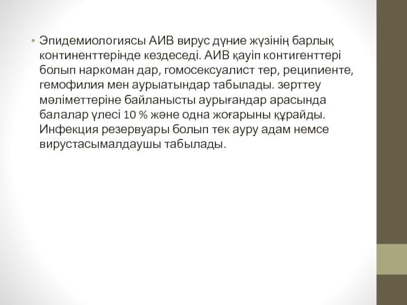 АИВ қауіп контигенттері болып наркоман дар, гомосексуалист тер, реципиенте, гемофилия