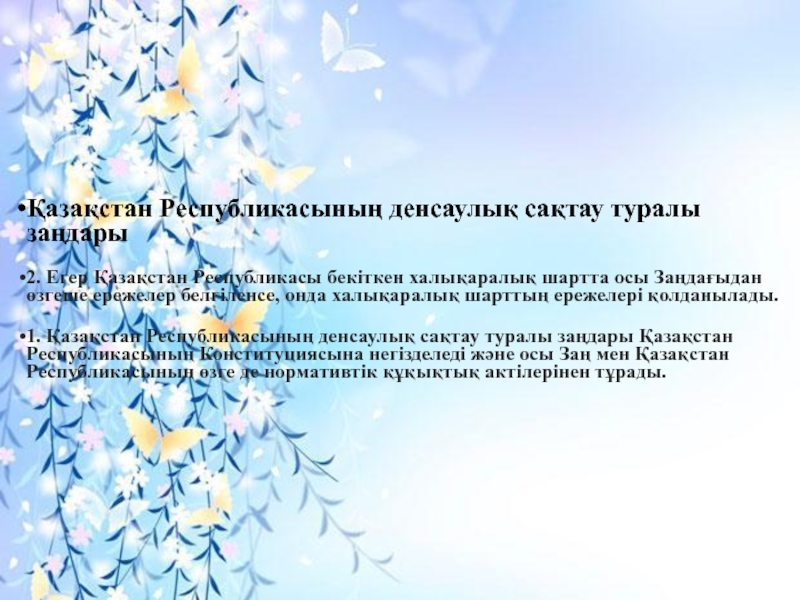 Слайд 1Қазақстандағы азаматтардың денсаулық сақтаудың құқықтық базалары:Қазақстанда Конституцияның ережелері заңнама Негіздері,